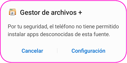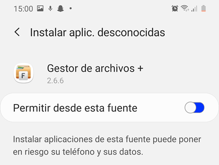 4.- Aparece una ventana donde nos pide permitir la instalacion desde fuentes externas, activamos la opcion "Permitir desde esta fuente".